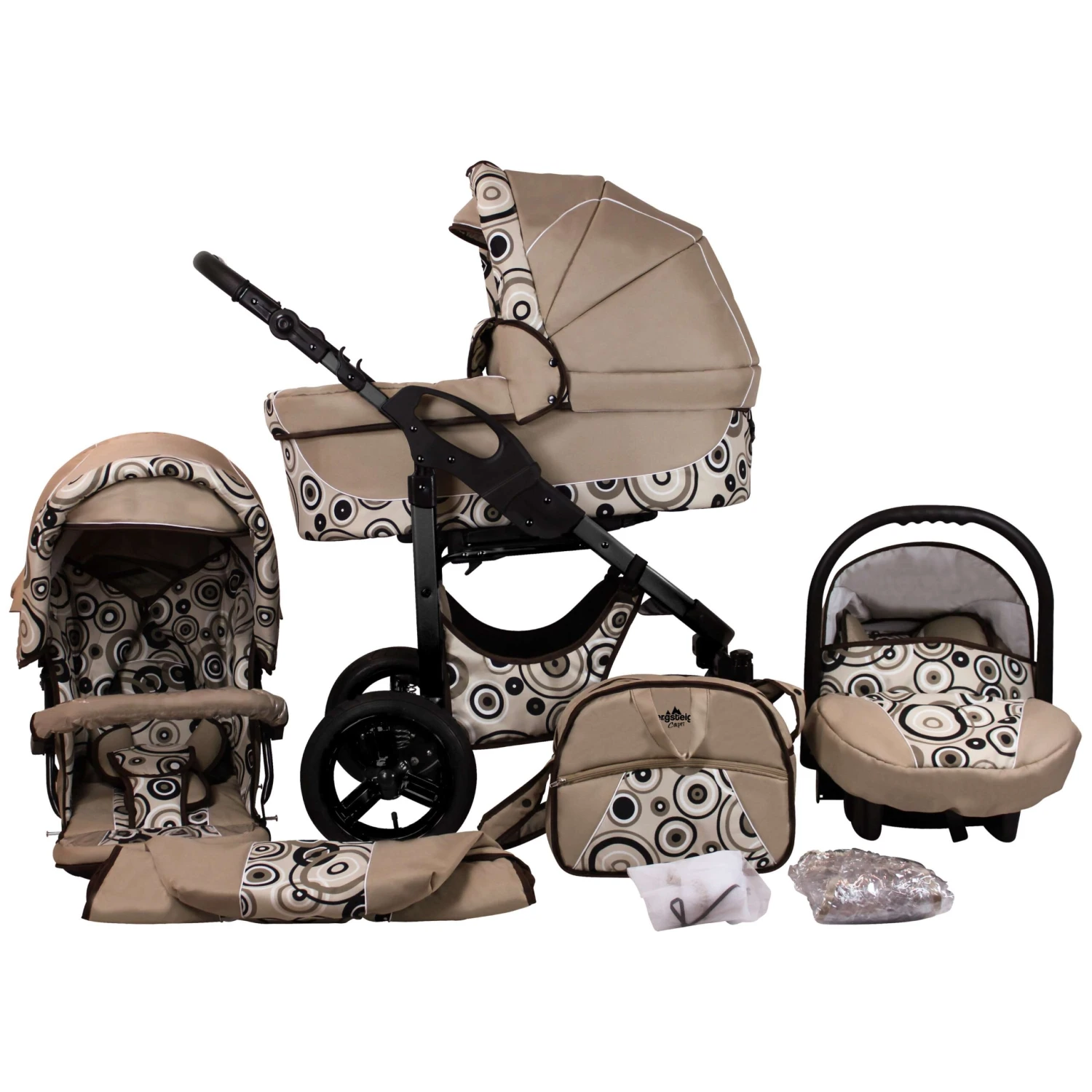Zu dem Bergsteiger Capri gehört ein umfangreiches Zubehör-Paket, sodass Sie immer gut ausgerüstet sind und alle Komponenten auch optisch perfekt zueinanderpassen. Mit dem Set erhalten Sie das Kinderwagengestell Bergsteiger Capri mit höhenverstellbarem Griff, eine Babywanne mit abnehmbarem Innenfutter sowie einen Buggy-Aufsatz, damit Sie den Liegewagen im Handumdrehen zu einem Sportwagen mit Fußsack umbauen können. Zusätzlich gehören eine komfortable und ECE R44/04-geprüfte Babyschale mit Wetterfußsack und Sonnenschutz für das Auto sowie eine praktische Wickeltasche, ein Moskitonetz, ein Regenschutz und ein Einkaufskorb zu diesem tollen Kinderwagen-Set.