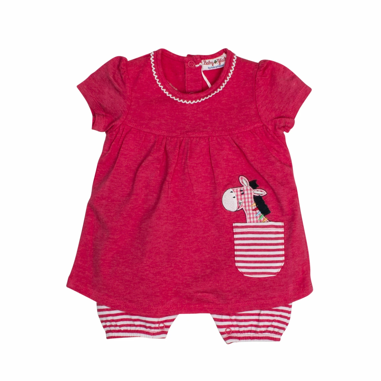 Sommerlich kurzes Mädchen-Shorty aus kuschelweicher Qualität. Das unifarbene Oberteil mit dezenter Raffung und kleiner Mausezahn-Bordüre am Halsauschnitt fällt locker über die niedlich gestreifte Shorts. Eine passend gestreifte kleine Tasche, aus der ein süßer applizierter Esel freudig heraus schaut, verziert mit liebevollen Stickdetails, wird zum Eyecatcher im vorderen Bereich. Die praktischen Druckknöpfchen im Rücken- und Schrittbereich erleichtern das bequeme An- und Ausziehen. Artikel fällt kleiner aus. Bitte eine Nummer größer bestellen.