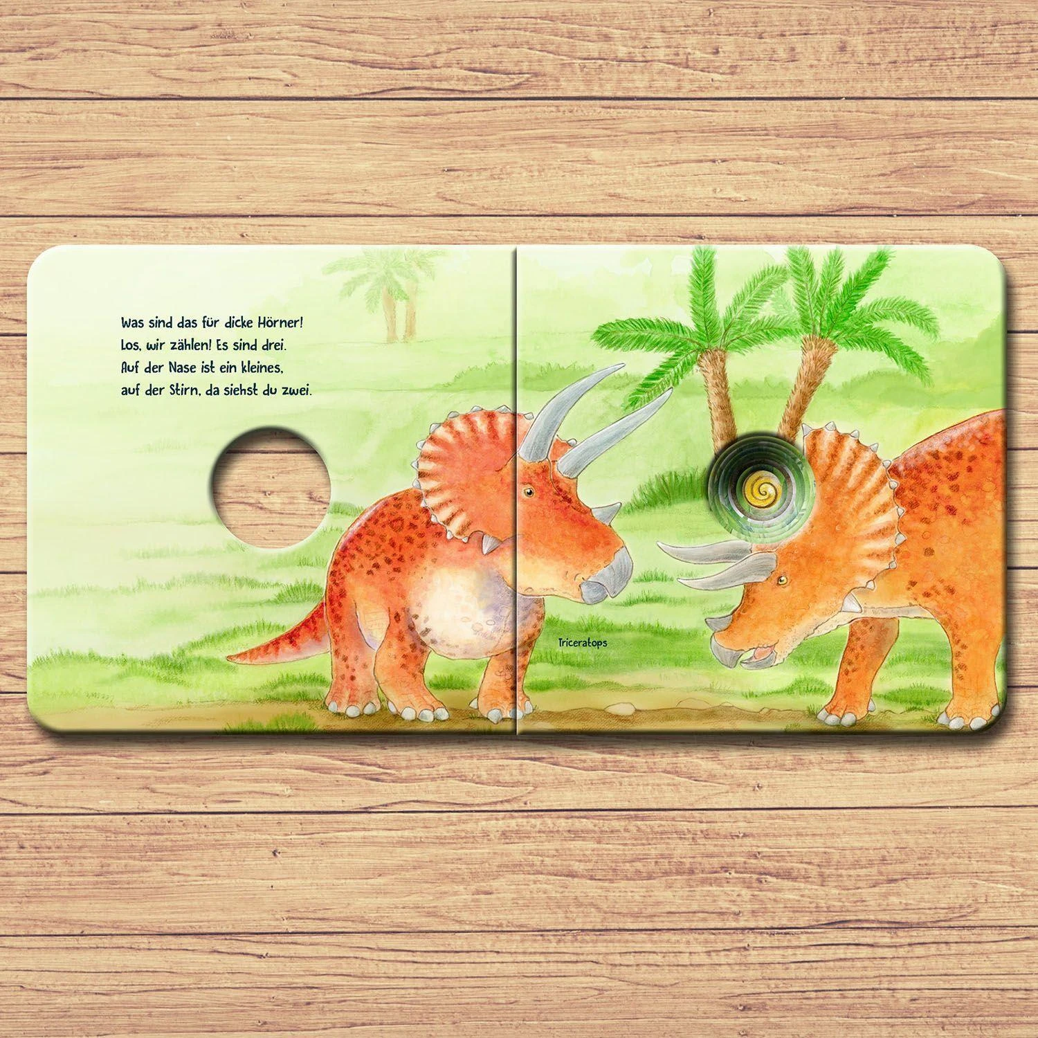 Nanu, Löcher im Buch? Ja, und zwar ganz besondere! Die Lochstanzungen lenken den Blick und die Fingerchen der Kinder in die geheimnisvolle Welt der Dinosaurier. Manche Dinos fliegen in der Luft, andere sind riesig oder durch Schild und Horn geschützt. Mit jedem Umblättern wird der Einblick in den Lebensraum der Tiere intensiver.