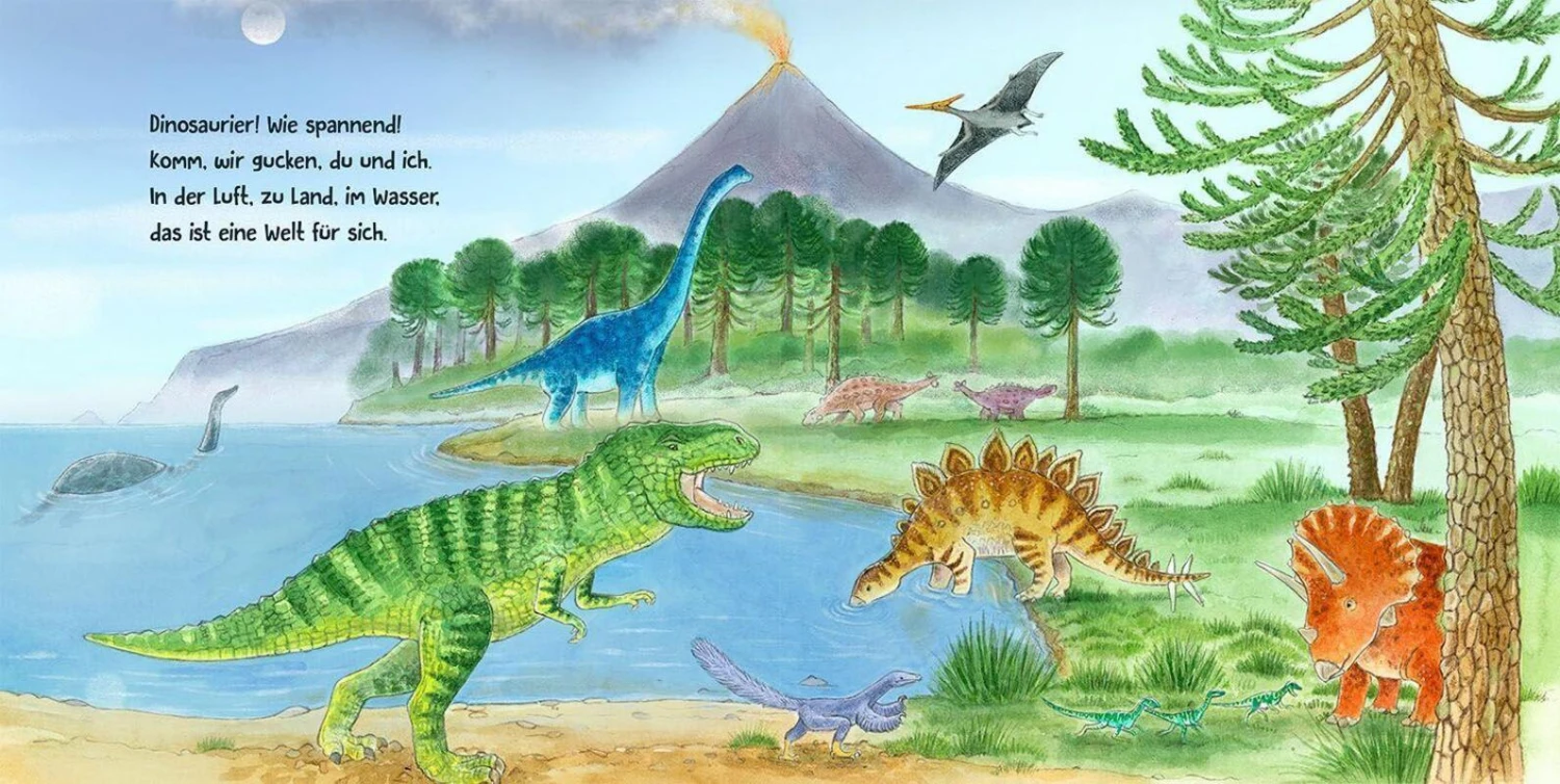 Zauberhafte Zeichnungen von Lisa Apfelbacher zeigen die Tiere der Urzeit in typischen oder lustigen Situationen, die die Kinder begeistern und sich einprägen. In charmanten Reimen von Regina Schwarz werden große Räuber, kleine Flitzer und fürsorgliche Mamasaurier vorgestellt.