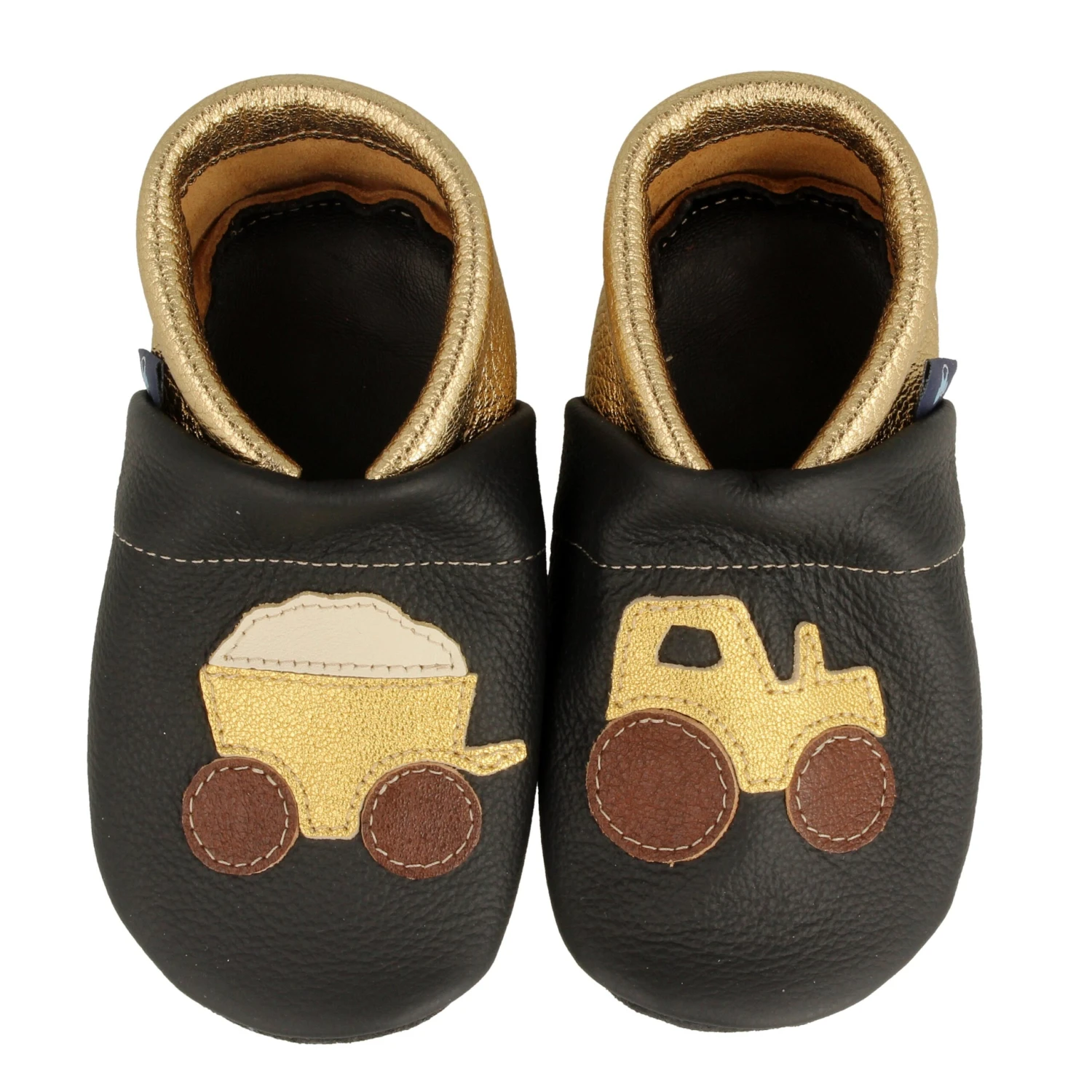 Krabbelschuhe / Lederpuschen Mit Traktor In Schwarz / Gold