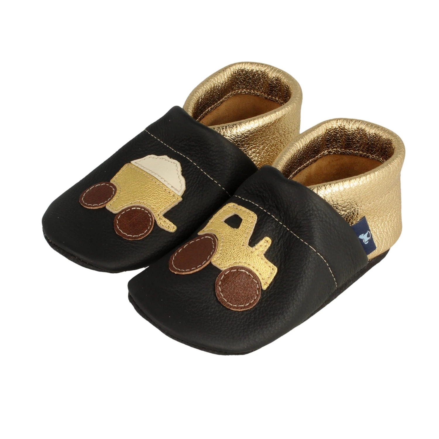 Krabbelschuhe / Lederpuschen Mit Traktor In Schwarz / Gold -Babyartikelgeschäft pantau its a small world krabbelschuhe lederpuschen mit traktor in schwarz gold 1