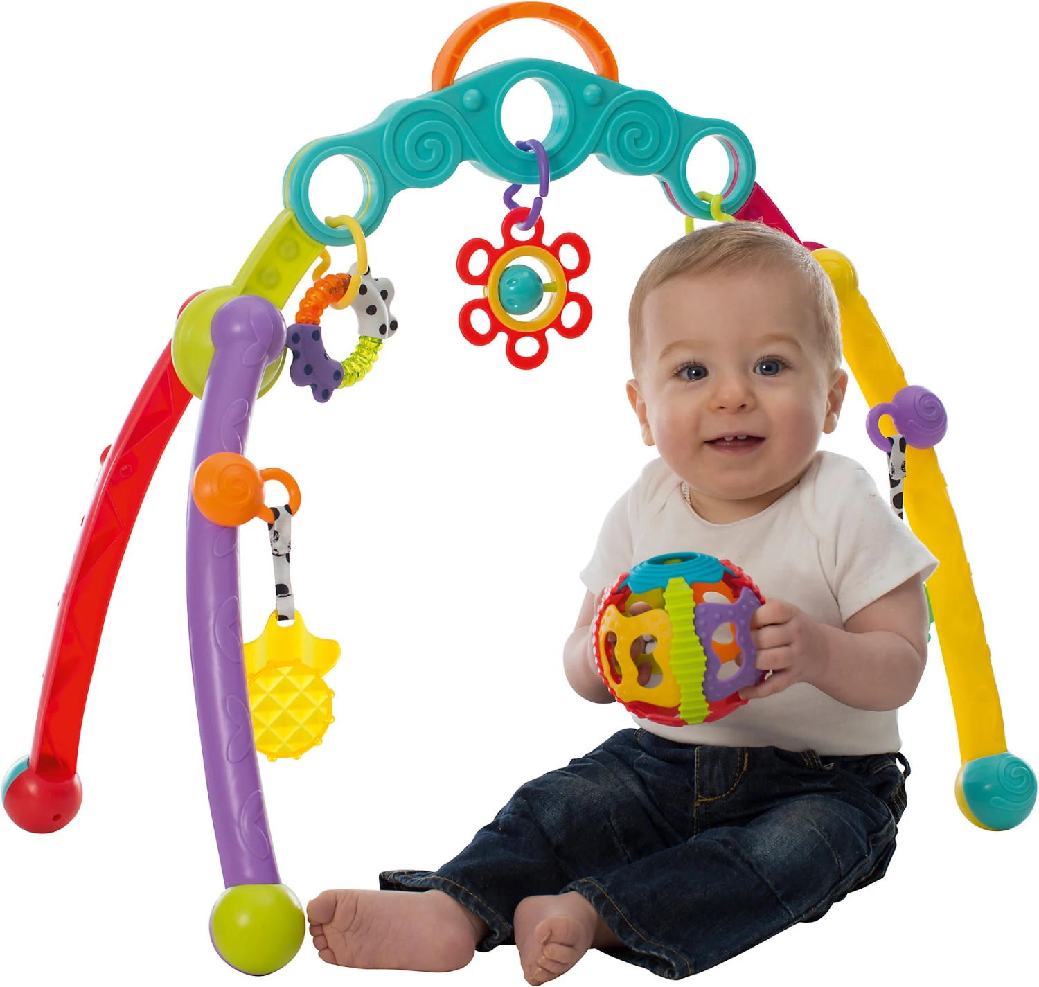3 unterschiedliche Beißringe lindern den Zahnungsschmerz der Kleinsten. Eine bunte Drehrassel lädt zum Entdecken ein. Der bunte Ball aus flexiblem Material kann einfach von Babyhänden gegriffen und später hin und her gerollt werden. Die kräftigen Farben und unterschiedlichen Oberflächen unterstützen die visuelle und taktile Wahrnehmung.