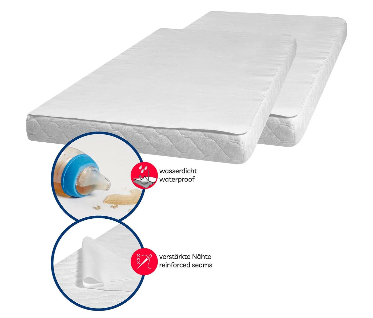 Die wasserdichte Matratzenauflage aus Molton und Frottee stoppt zuverlässig jede Flüssigkeit und ist nach der Maschinenwäsche schnell wieder trocken. Die Betteinlage kann als Unterlage für den Wickeltisch oder idealerweise ins Babybettchen unter das Bettlaken gelegt werden. Die große Babybetteinlage hält Matratzen trocken und ist für Babys gedacht, die das Schlafen ohne Windel noch üben. Die wasserdichte BABYSANA Betteinlage aus Molton und Frottee schützt Matratzen vor unerwünschter Nässe. Die obere Schicht der Matratzenauflage besteht aus Molton, innen befindet sich eine Nässespreeschicht und due untere Schicht besteht aus Frottee was die Auflage besonders hautfreundlich macht. Die Nässesperrschicht besteht zu 100% aus Polyurethan und macht den Matratzenschutz komplett wasser- und urinundurchlässig und schützt zusätzlich vor Milben. Für eine optimale Hygiene ist die Betteinlage bis zu einer Temperatur von 95°C wasch- und kochfest. Textiles Vertrauen – Oeko-Tex-Standard 100 Klasse 1 vom Institut Hohenstein auf Schadstoffe geprüft (Prüf-Nr. : 11. 0. 86164)