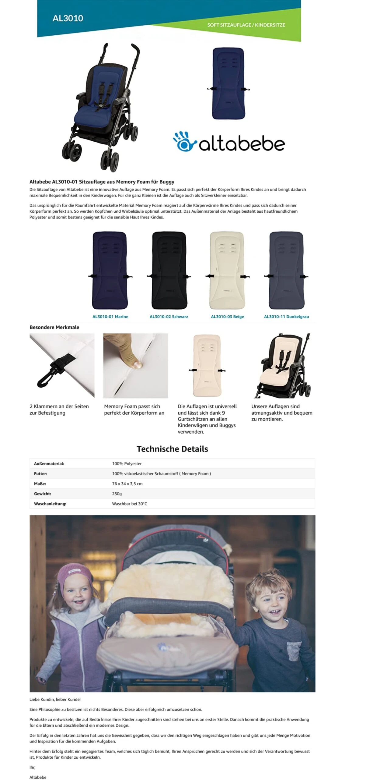 Die Sitzauflage von AltaBeBe ist eine innovative Auflage aus Memory foam. Es passt sich perfekt der Körperform Ihres Kindes an und bringt dadurch maximale Bequemlichkeit in den Kinderwagen. Für die ganz Kleinen ist die Auflage auch als Sitzverkleiner einsetzbar. Das ursprünglich für die Raumfahrt entwickelte Material Memory foam reagiert auf die Körperwärme Ihres Kindes und Pass sich dadurch seiner Körperform perfekt an. So werden Köpfchen und Wirbelsäule optimal unterstützt. Das Außenmaterial der Anlage besteht aus hautfreundlichem Polyester und somit bestens geeignet für die sensible Haut Ihres Kindes. Material: 100% Polyester, 100% Viscoelastic Foam