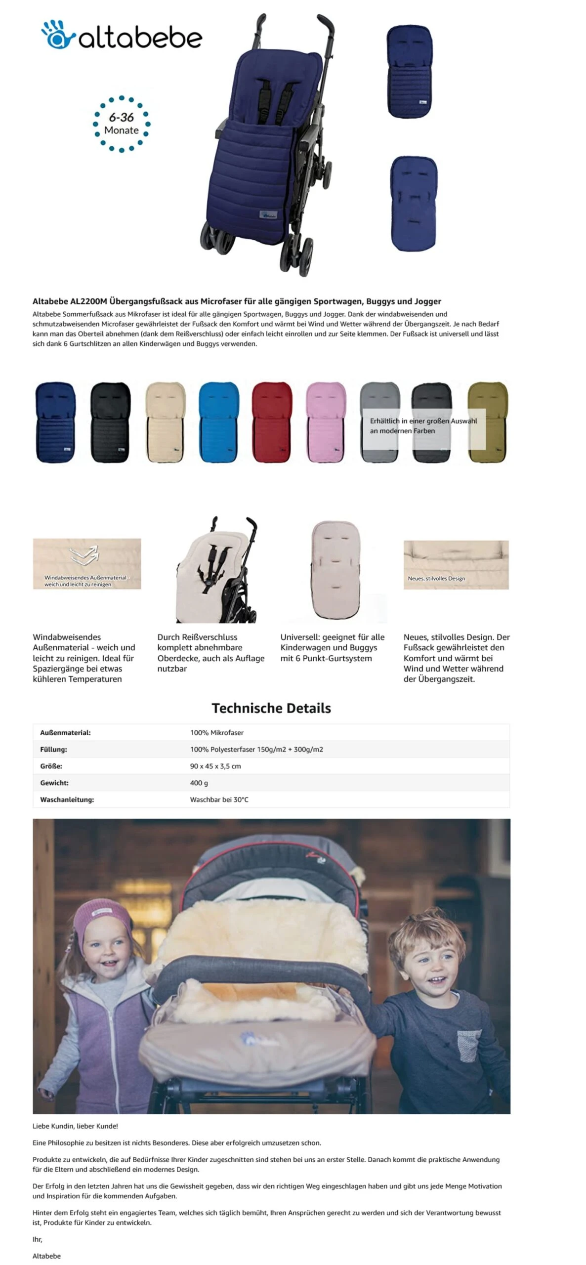 Altabebe Sommerfußsack aus Mikrofaser ist ideal für alle gängigen Sportwagen, Buggys und Jogger. Dank der windabweisenden und schmutzabweisenden Microfaser gewährleistet der Fußsack den Komfort und wärmt bei Wind und Wetter während der Übergangszeit . Je nach Bedarf kann man das Oberteil abnehmen (dank dem Reißverschluss) oder einfach leicht einrollen und zur Seite klemmen und das Kind muss an wechselhaften warm-frischen Tagen nicht im Sitzsack schwitzen oder frieren. Der Fußsack ist universell und lässt sich dank 6 Gurtschlitzen an allen Kinderwägen und Buggys verwenden. 9-36 Monate. Obermaterial: 100% Microfaser, Füllung: 100% Polyester