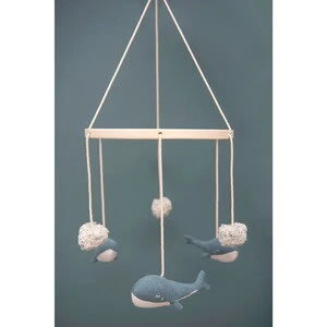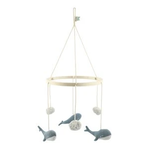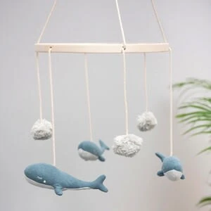 Das niedliche Mobile von Trixie lässt die Kleinen von Meerestieren und Unterwasserabenteuern träumen. Mobile Wal von Trixie mit 3 gestrickten Tieren und 3 Bommeln ca. 60 cm groß Tiere aus Bio-Baumwolle mit recycelter Füllung, Ring aus Holz ab Geburt geeignet Das süße Mobile begeistert mit drei gestrickten Walen aus Bio-Baumwolle und Füllung aus recyceltem Kunststoff und drei lustigen Bommeln. Die Elemente sind mit Schnüren an einem Holzring befestigt – durch das schlichte Design passt das Mobile perfekt in jedes Kinderzimmer. Dank praktischer Schlaufe kann das Mobile kinderleicht befestigt werden.